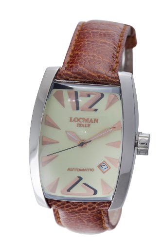 With its barrel-shaped, steel case and mod-style Arabic numerals at six and 12 o'clock, the Locman Men's Panorama Collection Steel Watch has vintage flair and high-quality materials for a distinctive look. This dress timepiece has a white dial with three hands, triangular markers, and a date display at four o'clock. A textured brown ostrich band looks rich and feels comfortable on the wrist, and closes with a secure deployment buckle. Perfect for work or dress wear, this Locman original boasts automatic self-wind movement for traditional appeal and reliable timekeeping.