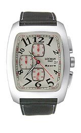 Quartz movement, Casual watch, Chronograph, Luminous hands, Black Arabic numbers, Analog date display, Brushed aluminum bezel, crown, selector buttons, case and caseback with four screws, Water resistant