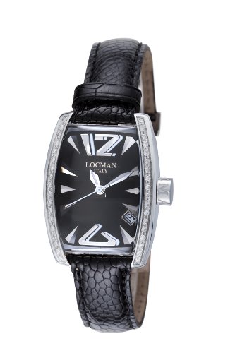 Incredibly glamorous and at the same time down-to-earth, the Locman Women's Panorama Collection Steel Watch pairs a diamond accented case with the laidback appeal of a black leather strap. A rich black dial showcases mod-style silver-tone Arabic numerals at six and 12 o'clock, silver-tone hands, and a convenient date display. An adjustable buckle provides a secure fit for all-day wear. Reliable and a pleasure to wear, this Locman original boasts the precision of quartz movement for optimum accuracy.